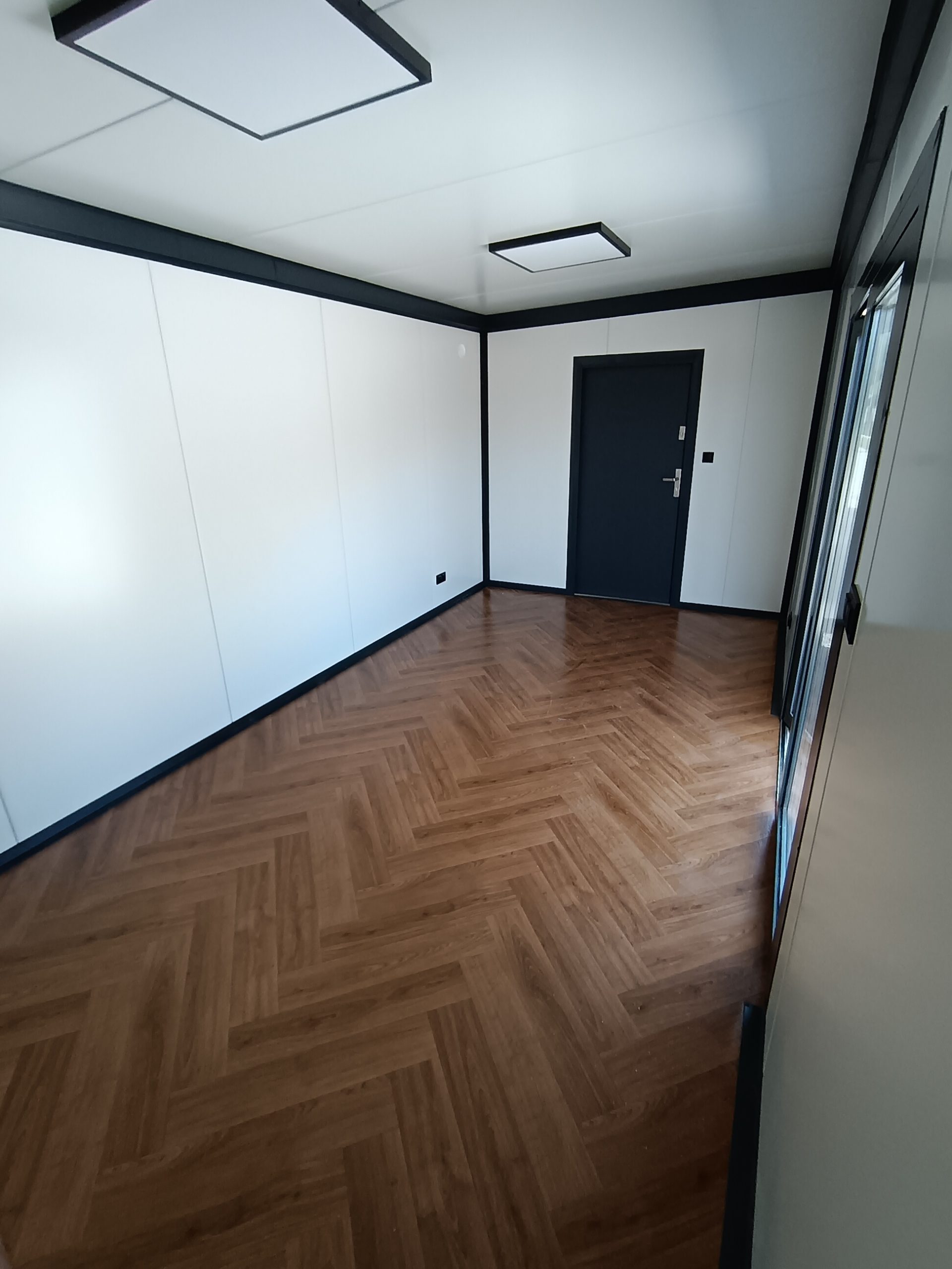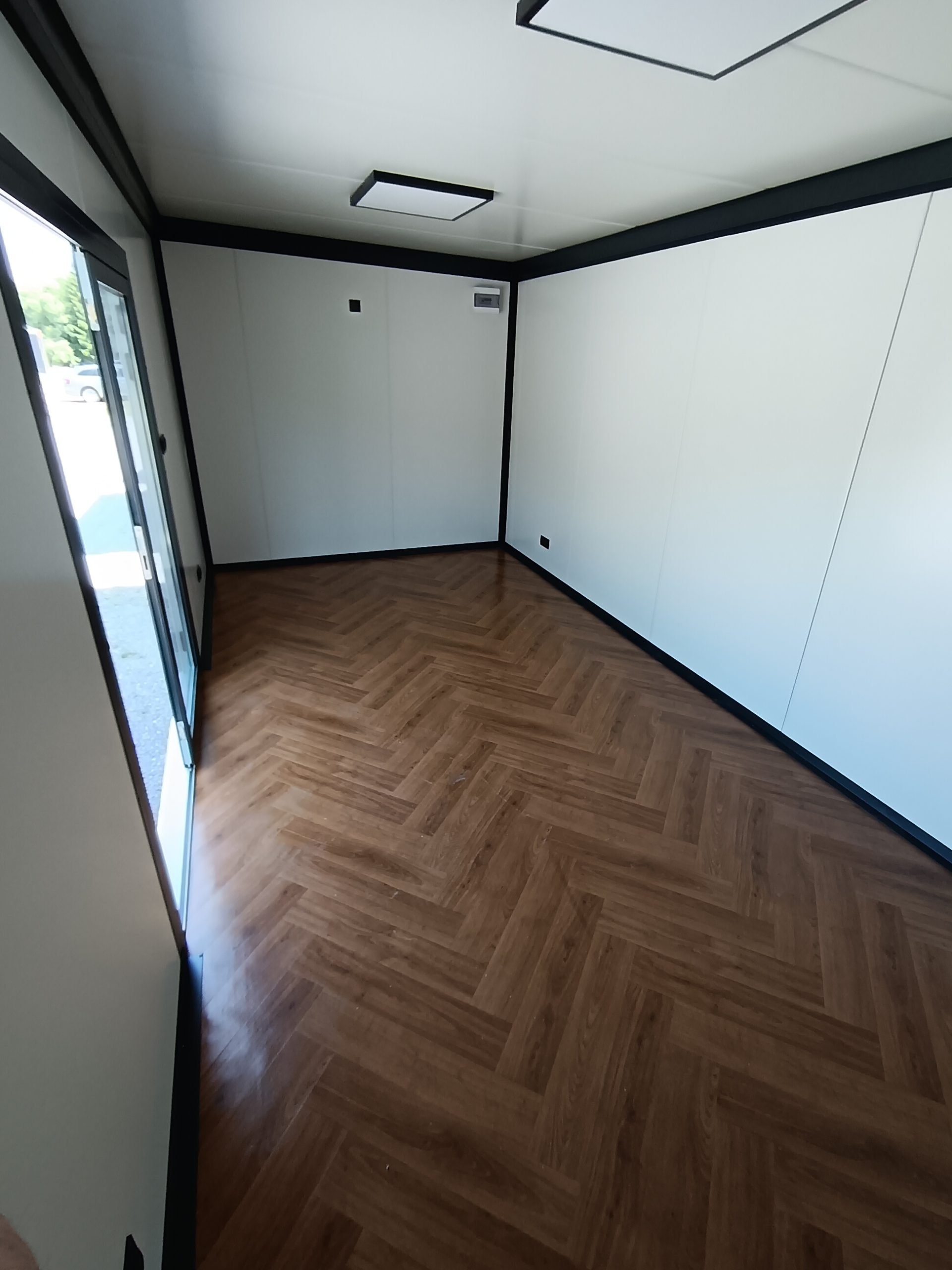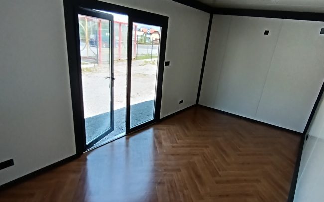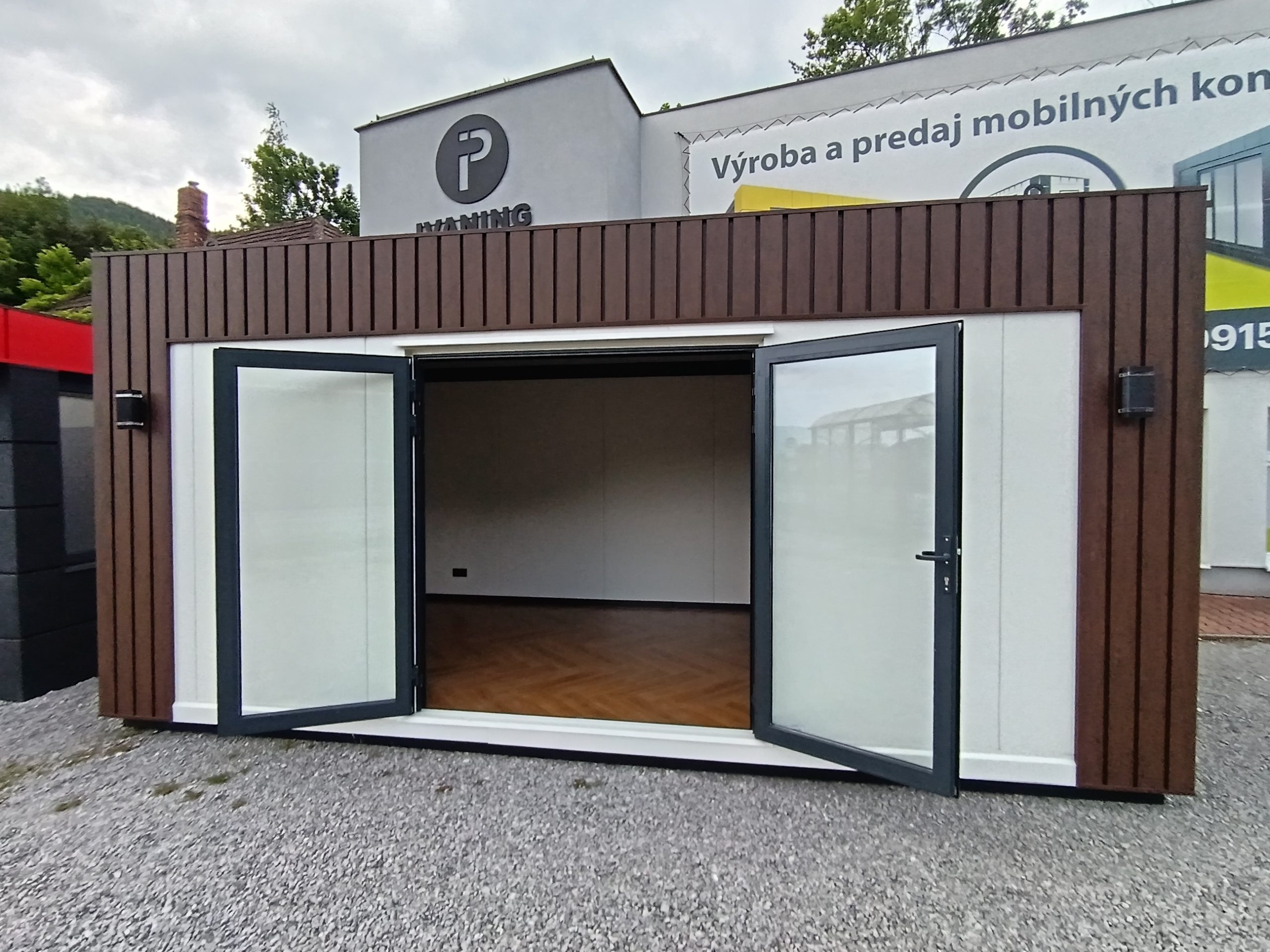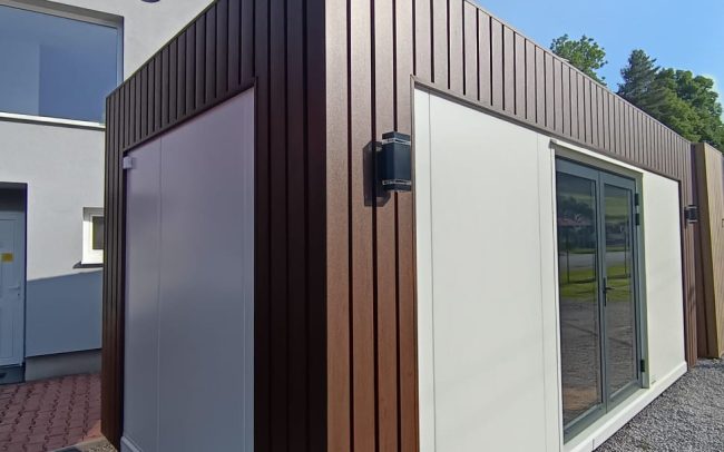 Dizajnový mobilný kontajner 6m x 3m z PIR panelu.prevedenie antracit plus Strieborná atika plus vkladaná atika.vstupnē presklenené dvere 110 x 210 hliníkové dvojsklo; 2 ks fix 100×200 hlinikove dvojsklo;.obsahuje príplatkový samonosný konštrukčný oceľový rám. 2 ks vonkajšie osvetlenie; LED svetlá vo vnútri; elektroinštalácia ťahaná v stene. dopravíme po celom Slovensku.cena dopravy nie je zahrnutá v cene kontajnera.IHNEĎ K ODBERU