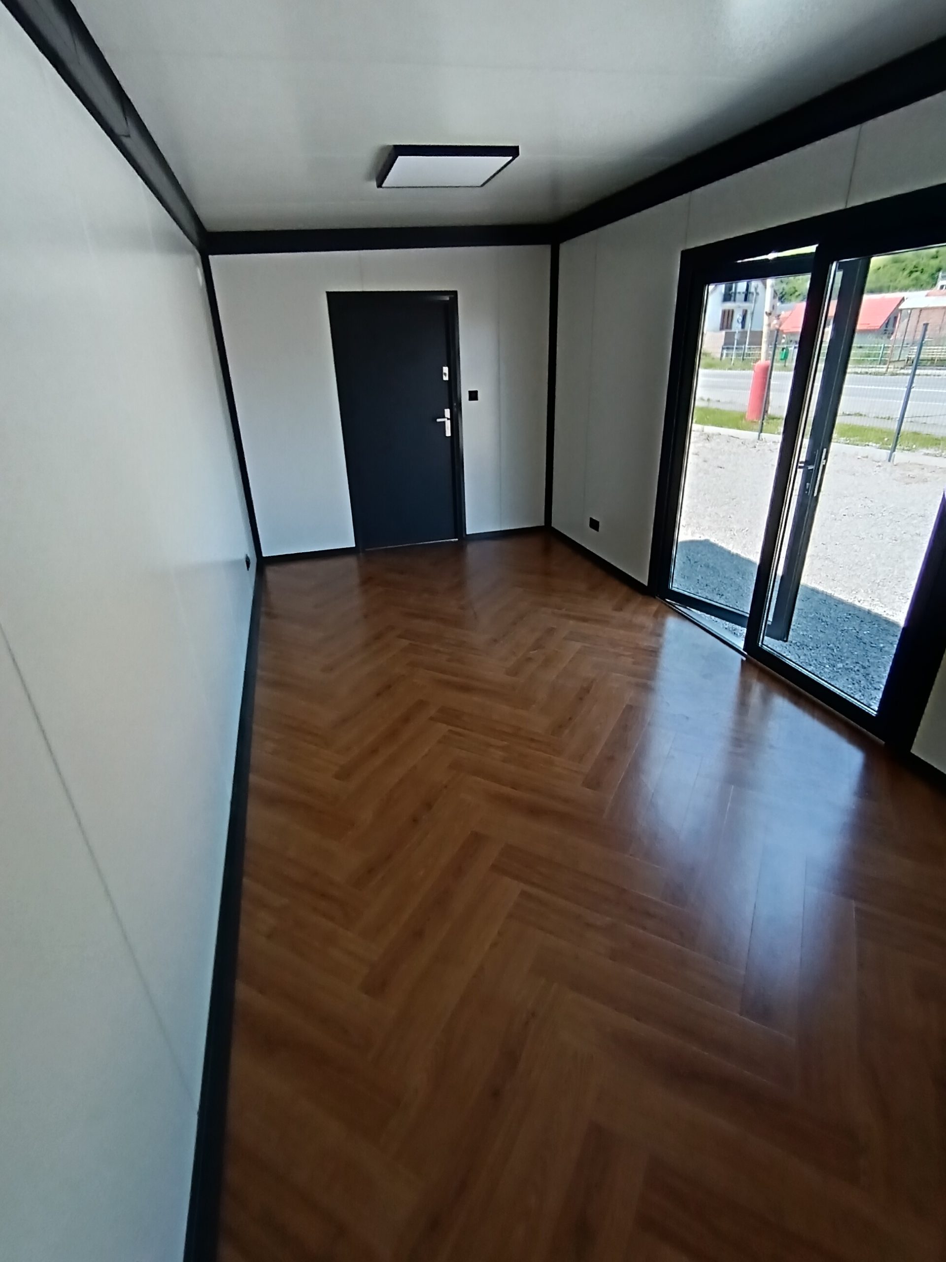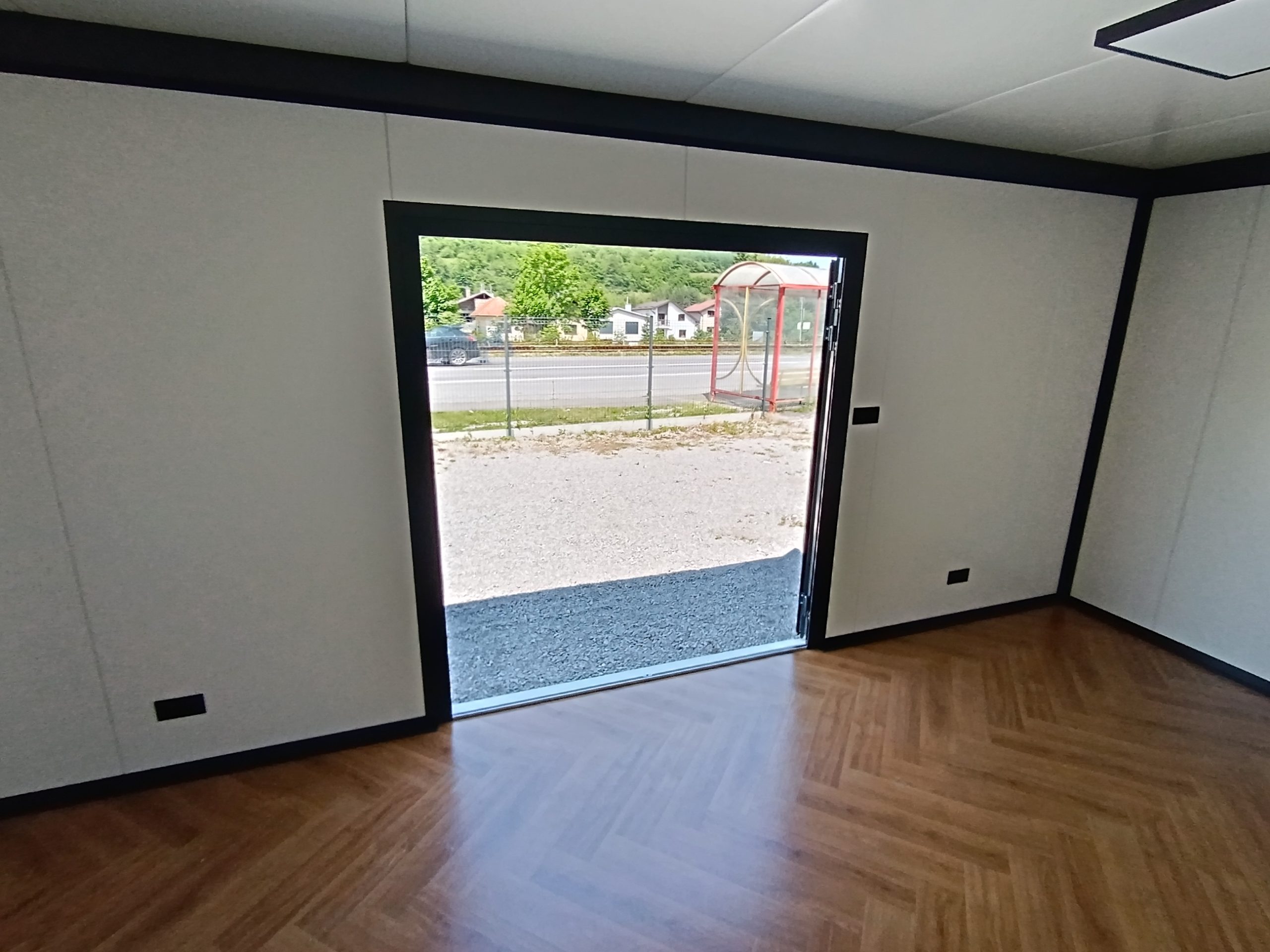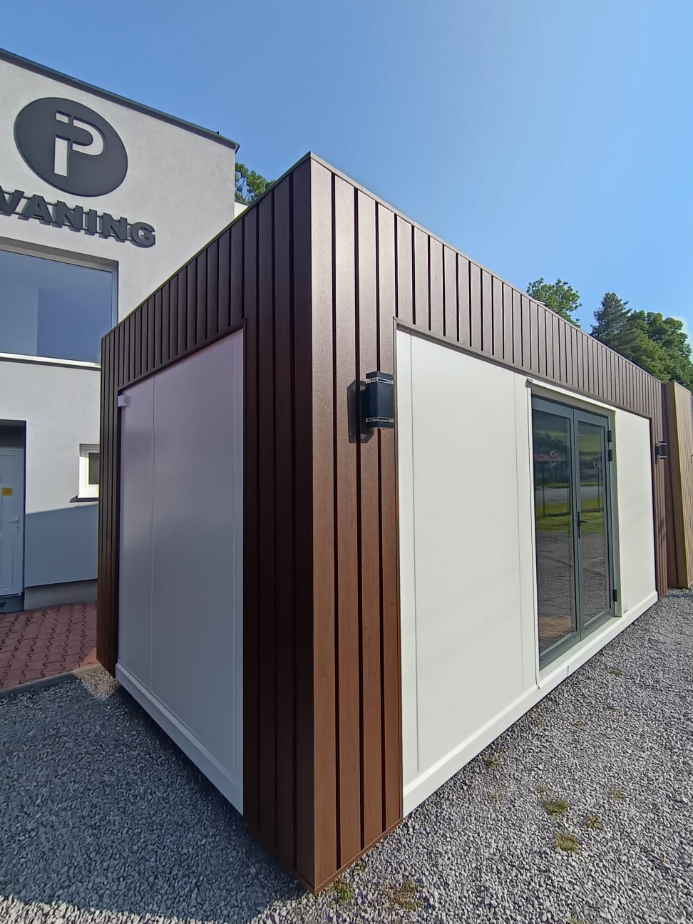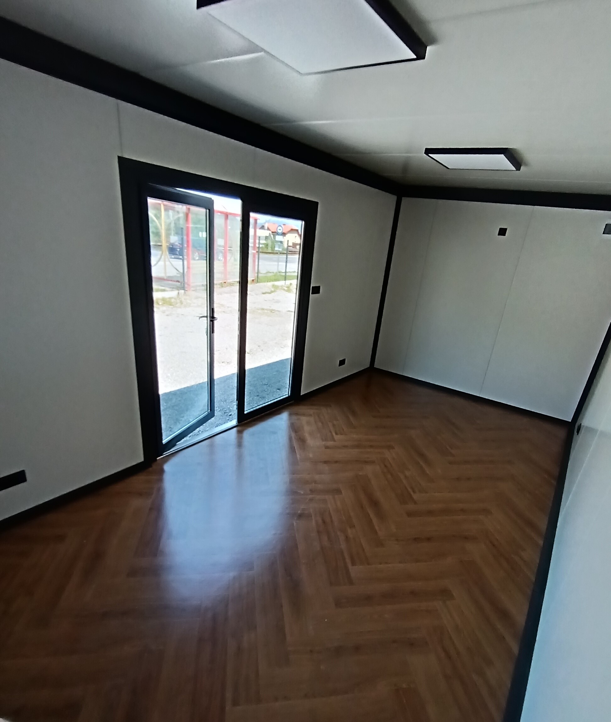 Dizajnový mobilný kontajner 6m x 3m z PIR panelu.prevedenie antracit plus Strieborná atika plus vkladaná atika.vstupnē presklenené dvere 110 x 210 hliníkové dvojsklo; 2 ks fix 100×200 hlinikove dvojsklo;.obsahuje príplatkový samonosný konštrukčný oceľový rám. 2 ks vonkajšie osvetlenie; LED svetlá vo vnútri; elektroinštalácia ťahaná v stene. dopravíme po celom Slovensku.cena dopravy nie je zahrnutá v cene kontajnera.IHNEĎ K ODBERU
